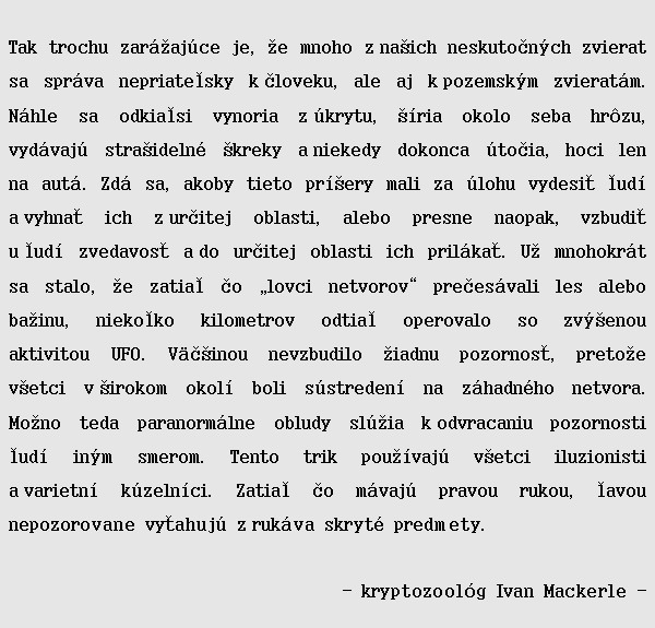 „Sú to typickí predstavitelia „neznámych zvierat“ skrývajúci sa pred človekom na ťažko prístupných miestach v hustom pralese, v barinách, v hlbokých jazerách, v horách alebo v rozľahlých neobývaných priestoroch púští a stepí,“ píše český bádateľ a spisovateľ Ivan Mackerle vo svojej knihe „Odkiaľ prichádzajú?“. „Aj domorodci ich pozorujú len veľmi zriedkavo a náhodne. Oficiálna veda ich neuznáva a odkazuje do ríše výmyslov a bájok. Racionálni ľudia si radi udržiavajú klamlivú predstavu, že všetky zvieratá už boli objavené a pred našou modernou technikou sa žiadny neznámy živočích nemôže ukryť. Napriek tomu existuje skupina ľudí nazývaných kryptozoológovia, ktorí po týchto tvoroch pátrajú. Podľa nich to môžu byť doteraz neznáme živočíšne druhy, alebo zvieratá, už domnelo vyhynuté. Keď zviera skutočne odhalia a odchytia, odovzdajú dôkazy bežným zoológom, ktorí sa tak trochu zahanbia, rozpačito poškriabu na hlave, ale potom už zviera rutinne popíšu a zaškatuľkujú. Z neznámeho zvieraťa sa stane známe, ktoré už novinárov a verejnosť ďalej nezaujíma. Takto už bolo objavených mnoho zvierat, spočiatku považovaných za obyčajné výmysly.“